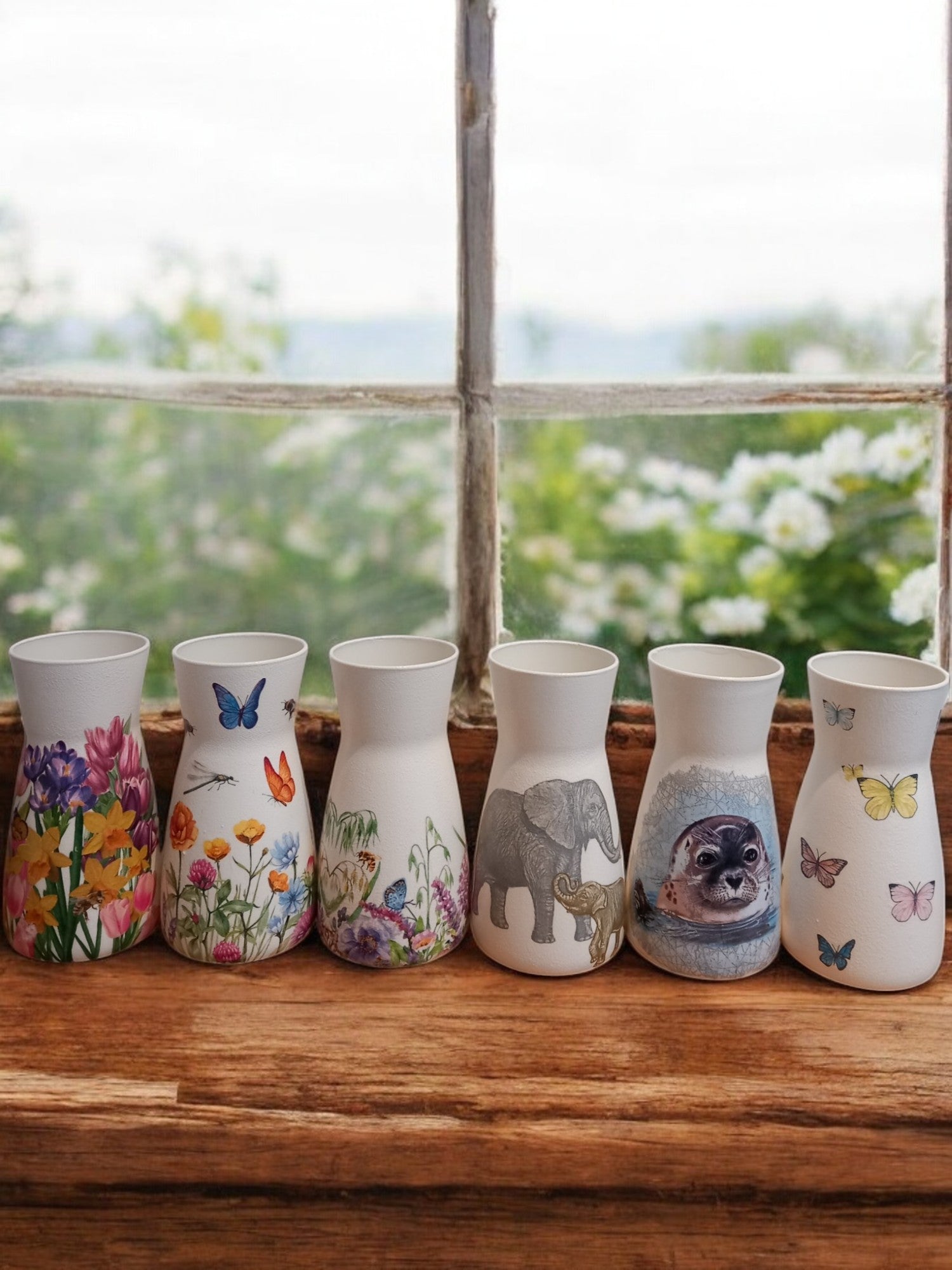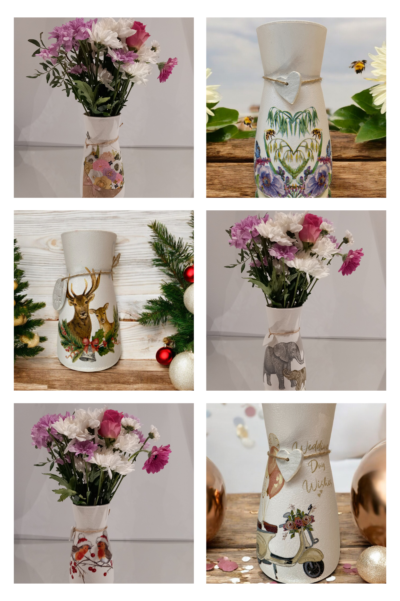 Beautiful handmade vases, bottles and coasters which have been hand painted, decoupaged with a beautiful design and finished with waterproof varnish and a clay heart tag tied with natural twine, all items come wrapped in tissue paper a perfect gift for all occasions.