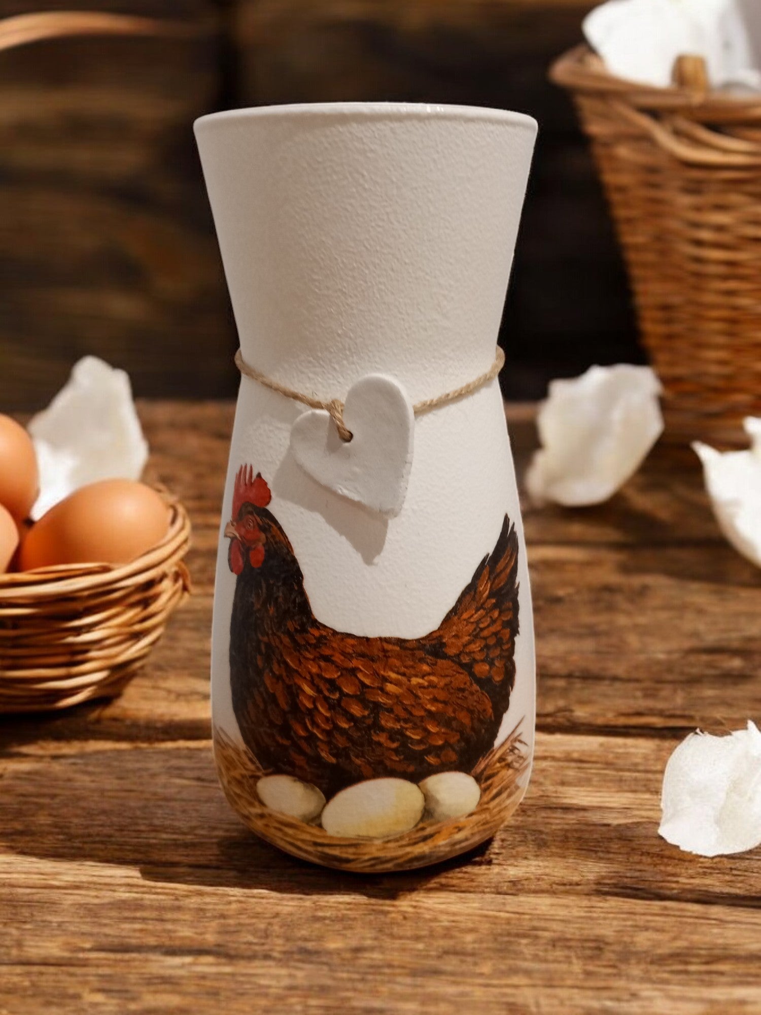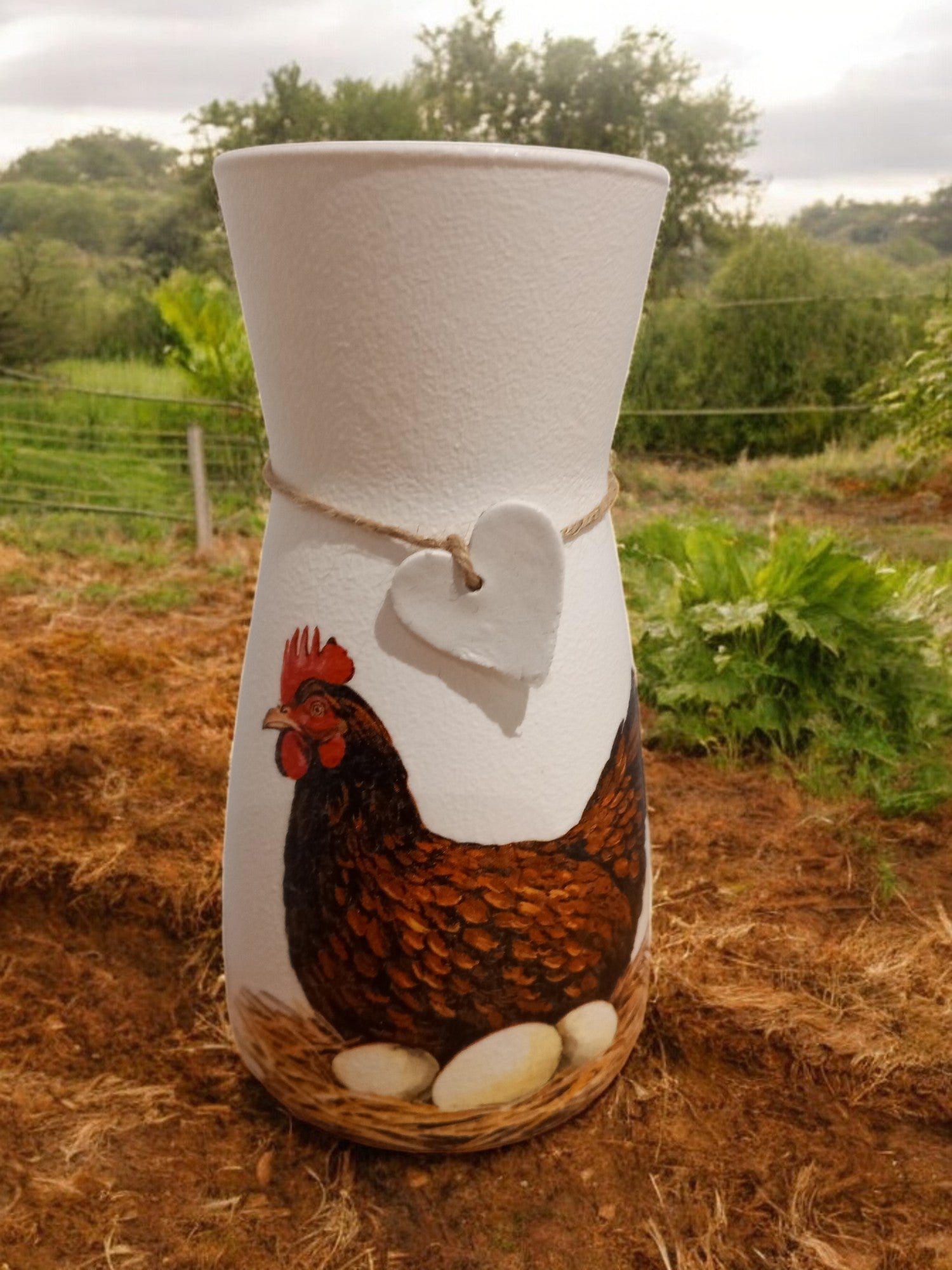 This glass vase has been hand painted, decoupaged with a beautiful Chicken with eggs design, finished with waterproof varnish and a clay heart tag tied with natural twine, the perfect gift for a loved one or your own home decor.