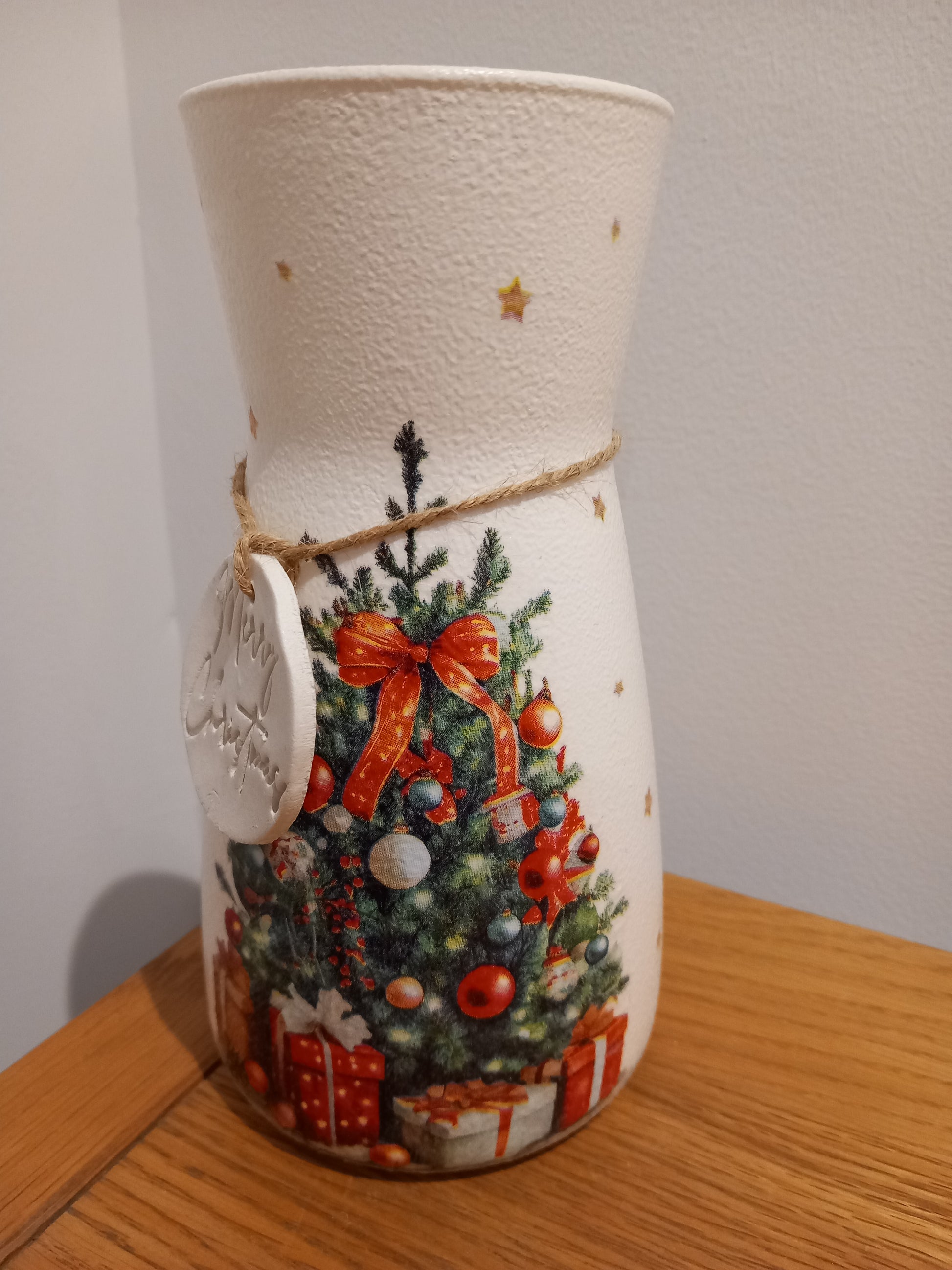 This glass vase has been hand painted, decoupaged with a beautiful traditional Christmas tree design, finished with waterproof varnish and a clay heart tag tied with natural twine, the perfect gift for a loved one.