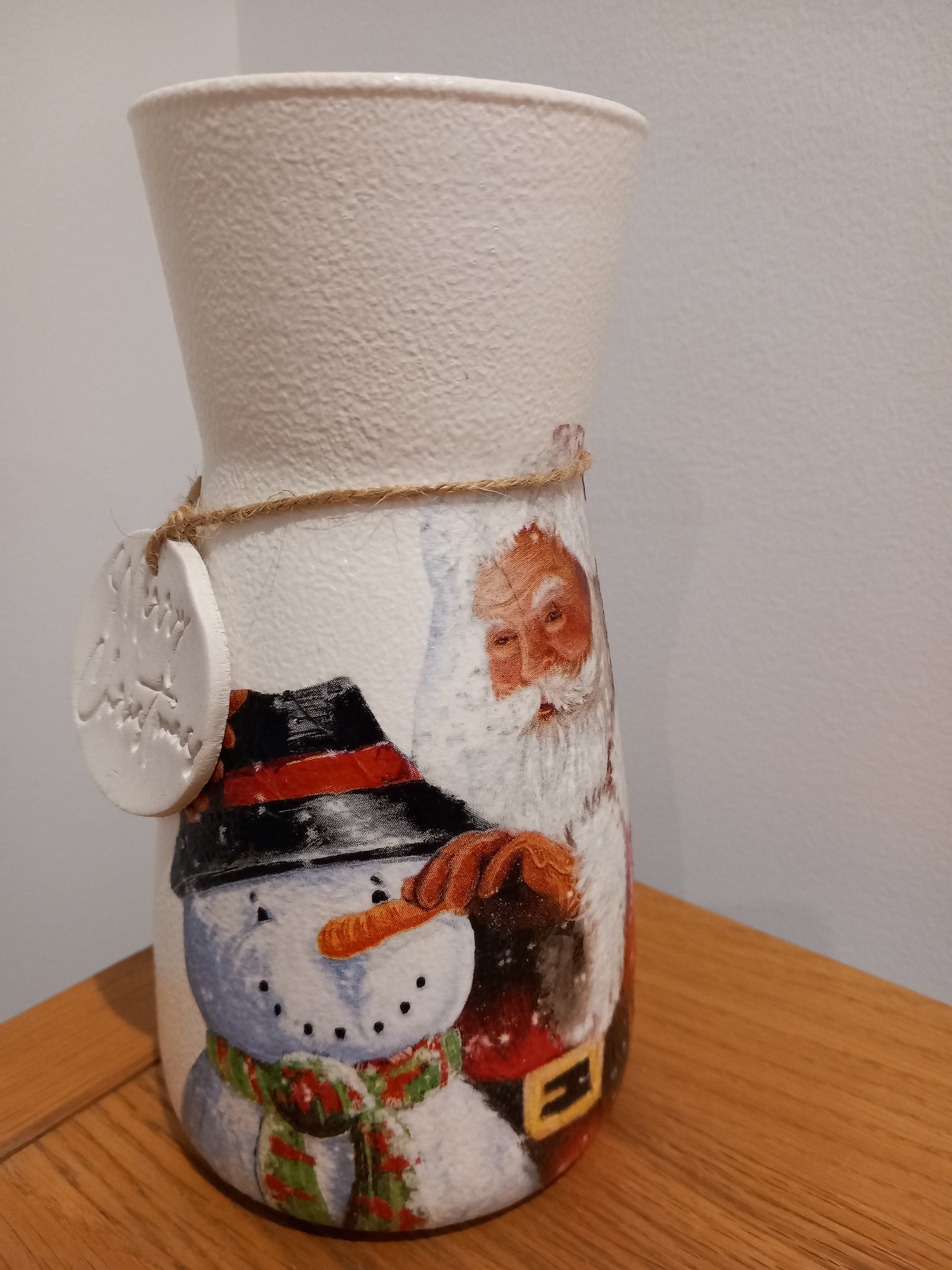 This glass vase has been hand painted, decoupaged with a beautiful Father Christmas & snowman design, finished with waterproof varnish and a clay heart tag tied with natural twine, the perfect gift for a loved one.