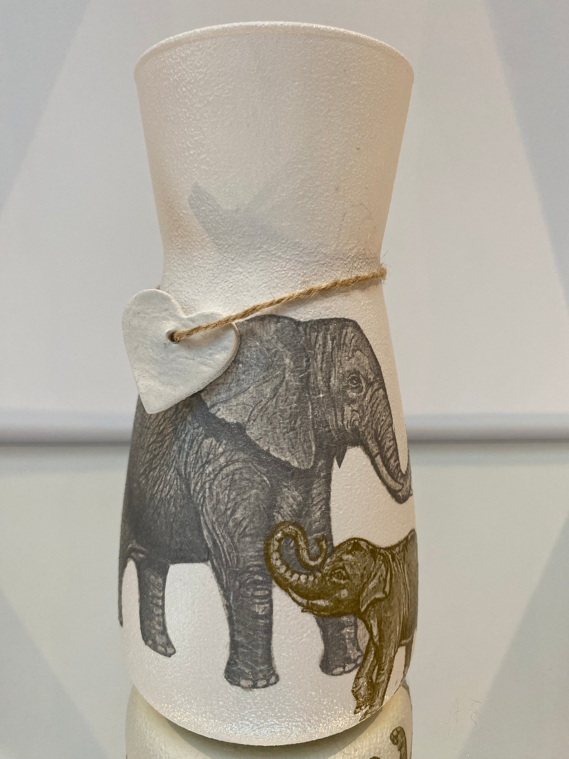 This glass vase has been hand painted, decoupaged with a beautiful elephant design, finished with waterproof varnish and a clay heart tag tied with natural twine, the perfect gift for a loved one.
