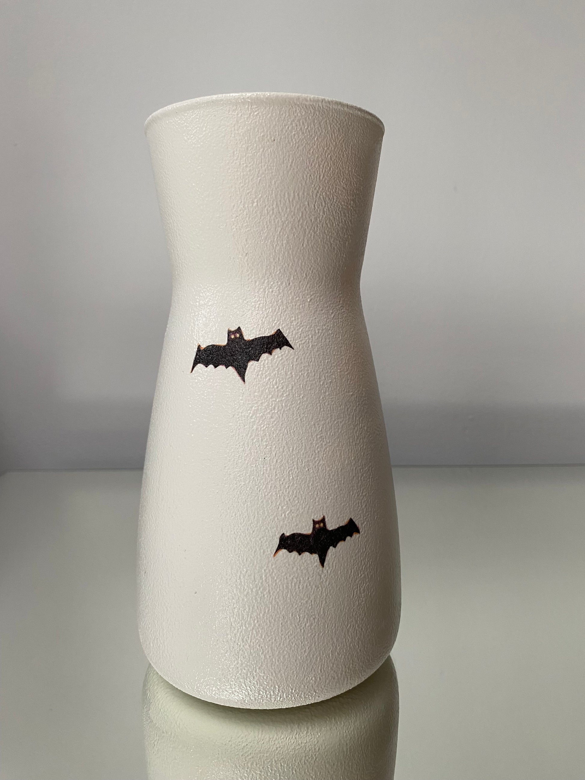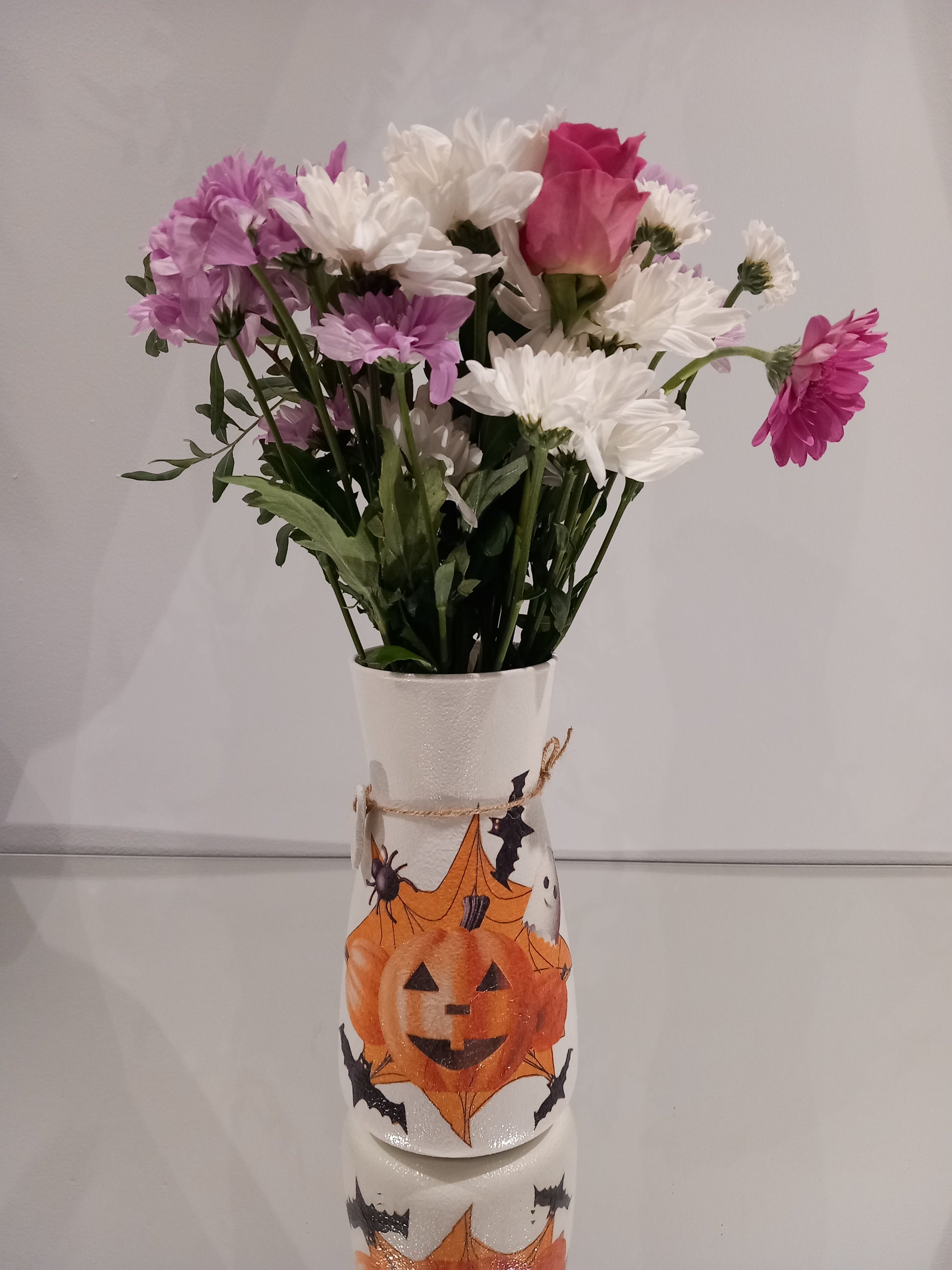 This glass vase has been hand painted, decoupaged with a scary Halloween design, finished with waterproof varnish and a clay heart tag tied with natural twine, the perfect gift for a loved one.
