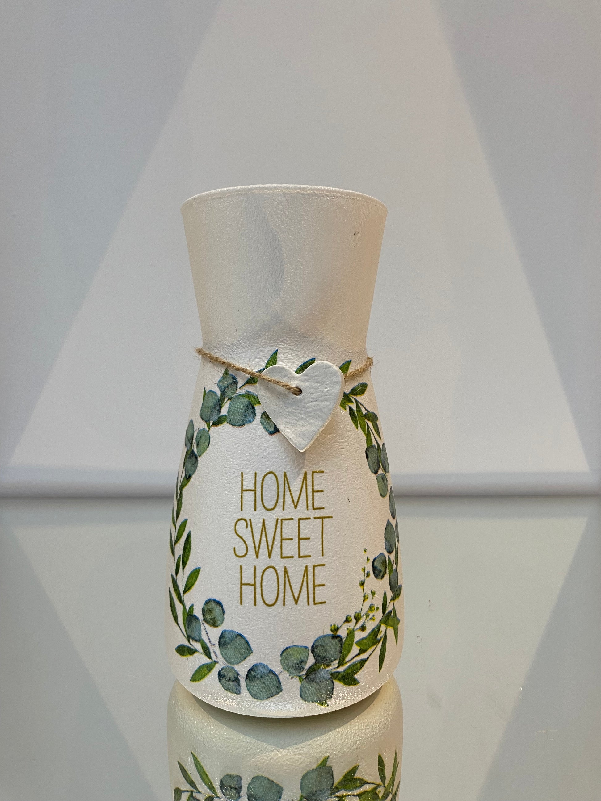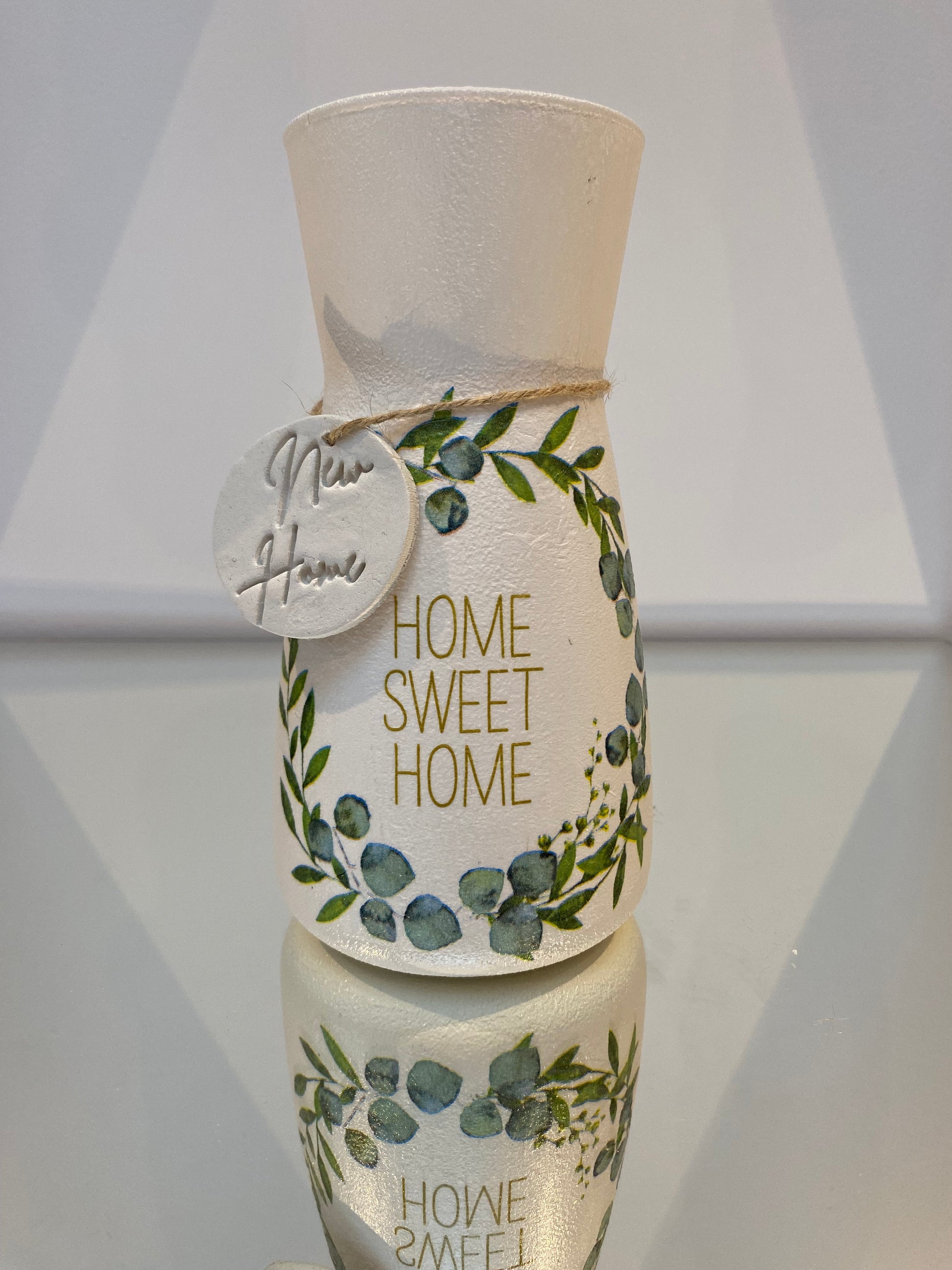 This glass vase has been hand painted, decoupaged with a beautiful new home design, finished with waterproof varnish and a clay heart tag tied with natural twine, the perfect gift for a loved one.