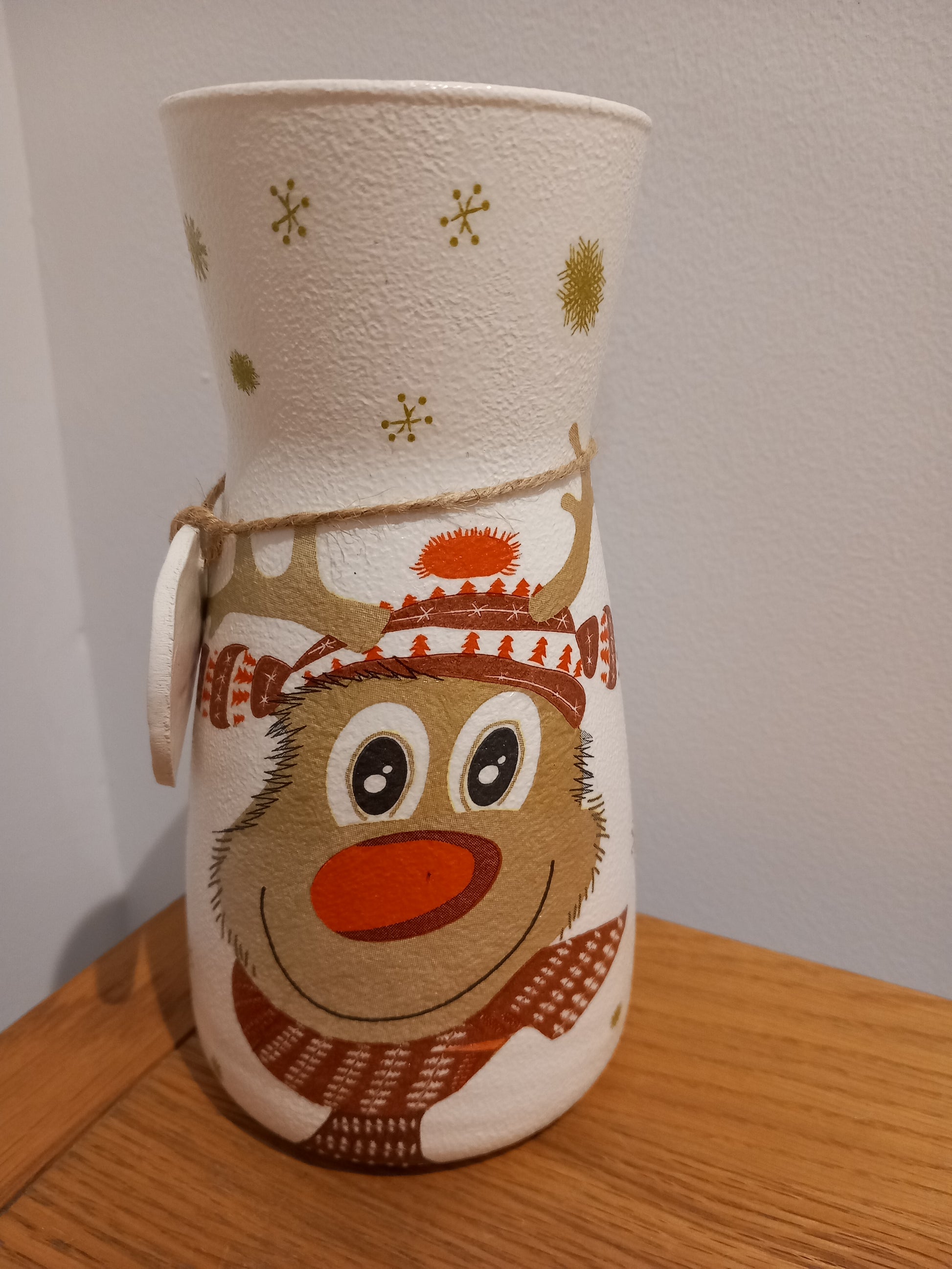 This glass vase has been hand painted, decoupaged with a beautiful jolly Reindeer design, finished with waterproof varnish and a clay heart tag tied with natural twine, the perfect gift for a loved one.