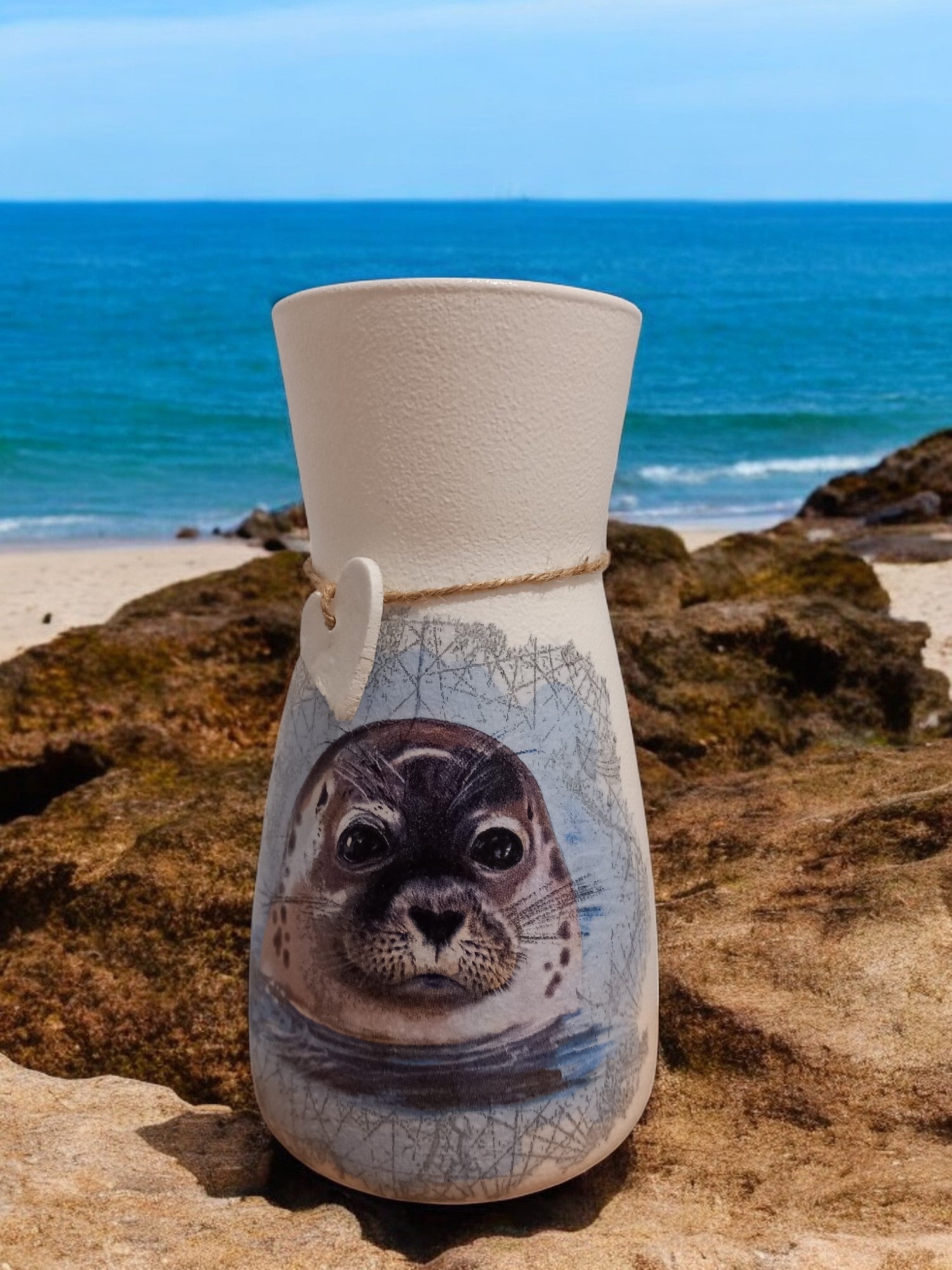 This glass vase has been hand painted, decoupaged with a beautiful seal design, finished with waterproof varnish and a clay heart tag tied with natural twine, the perfect gift for a loved one or your own home.
