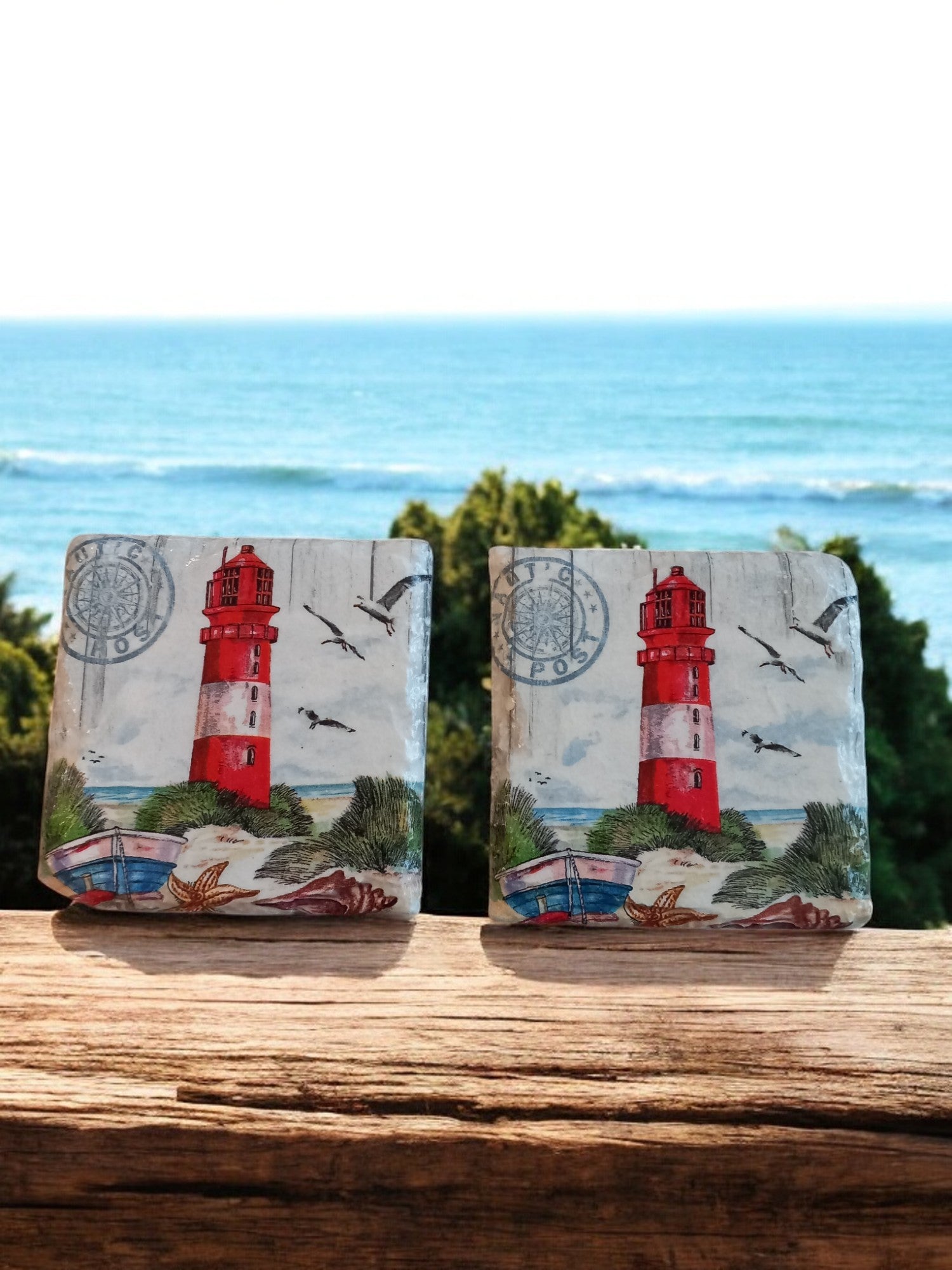 These slate coasters have been decoupaged with a beautiful lighthouse design, finished with heat resistant varnish, packaged in bubble wrap and tissue paper tied with a clay heart and natural twine, the perfect gift for a loved one.