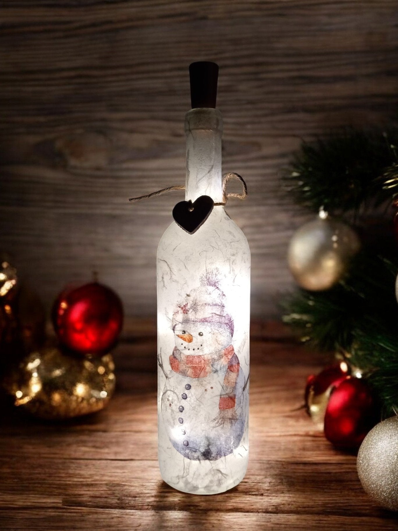 Christmas snowman Led light up bottle, featuring a cute snowman design a perfect gift for a loved one or for your own home decor, lights come with a safety screw please keep away from children, vulnerable adults and pets, finished with varnish and a clay heart tied with twine 30cm high.