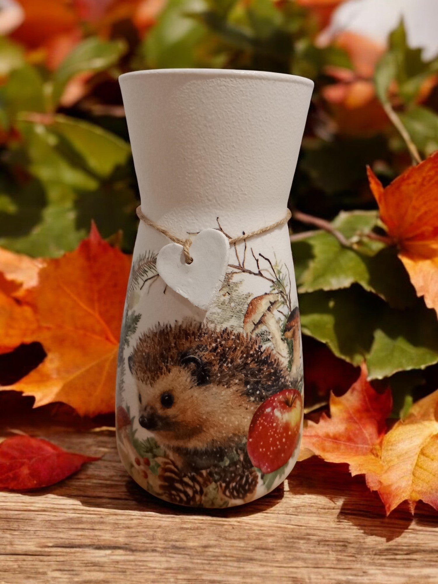 This glass vase has been hand painted, decoupaged with a beautiful winter hedgehog design, finished with waterproof varnish and a clay heart tag tied with nateral twine, the perfect gift for a loved one or your own home decor.